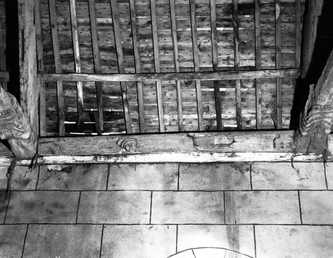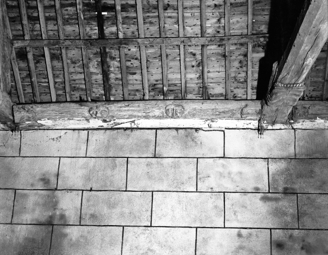 Traces de polychromie ancienne visibles sur certaines sablières.