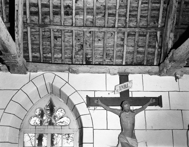 Les sablières en bois sont disposées autour de la nef sur les murs Nord et Sud, reliées entre elles par 5 entraits à têtes d'engoulants ornés d'écus en leur centre. Deux sablières ont entièrement perdu leur décor.