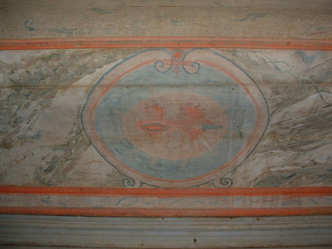 Cet autel est orné de deux coeurs enflammés peints dans un médaillon central et de motifs floraux aux angles.