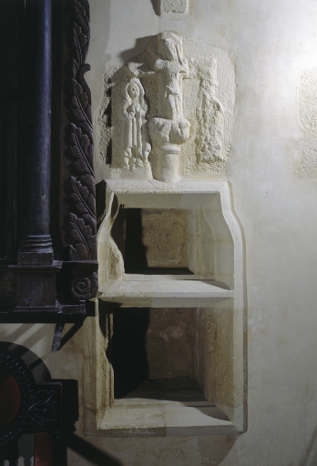 Bas-relief encastré de la Crucifixion surmontant la crédence gauche du mur Est du choeur. Le Christ en croix est accompagné à sa droite d'une Vierge représentée les mains jointes dans une attitude d'imploration tandis que le personnage situé à gauche, probablement saint Jean, a disparu.