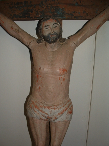 Christ en croix vêtu d'un périzonium court, les jambes pliées terminées par des pieds croisés.