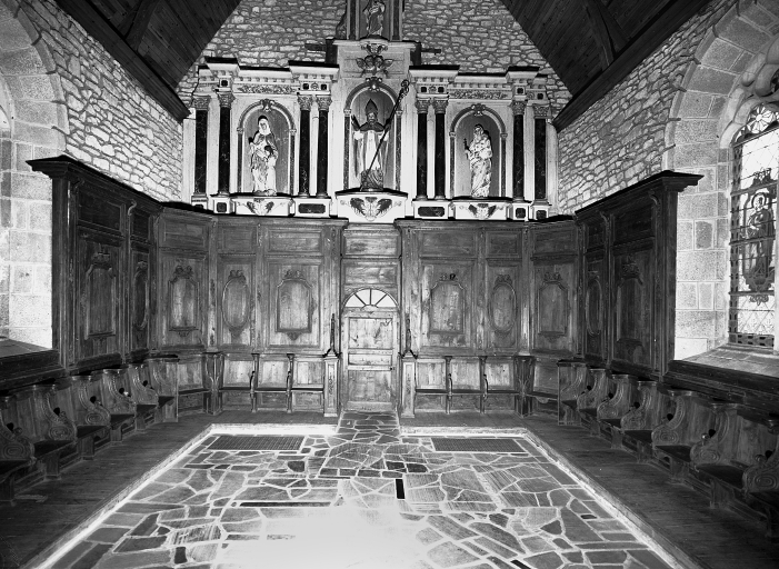 Le lambris et les 28 stalles sont disposés sur le pourtour du choeur. Ce décor se compose de trois étages : une ceinture de stalles et une boiserie faite de panneaux ornés d'ovales ou de rectangles décorés de têtes d'angelots surmontés de panneaux moulurés rectangulaires et d'une corniche. Chacun des panneaux à médaillons rectangulaires occupe la largeur de deux sièges tandis que les panneaux à médaillons ovales occupent la largeur d'un siège. Au centre du mur Est, une porte donne accès à la sacristie. Sur les 4 premiers panneaux du choeur, au Nord et au Sud, ont été rapportés les figures en demi-relief des quatres Evangélistes provenant sans doute de l'ancienne chaire à prêcher.