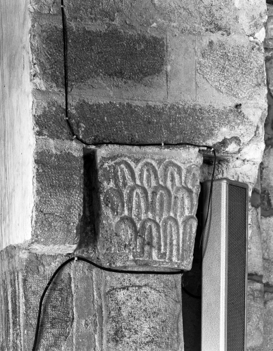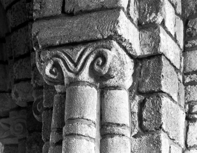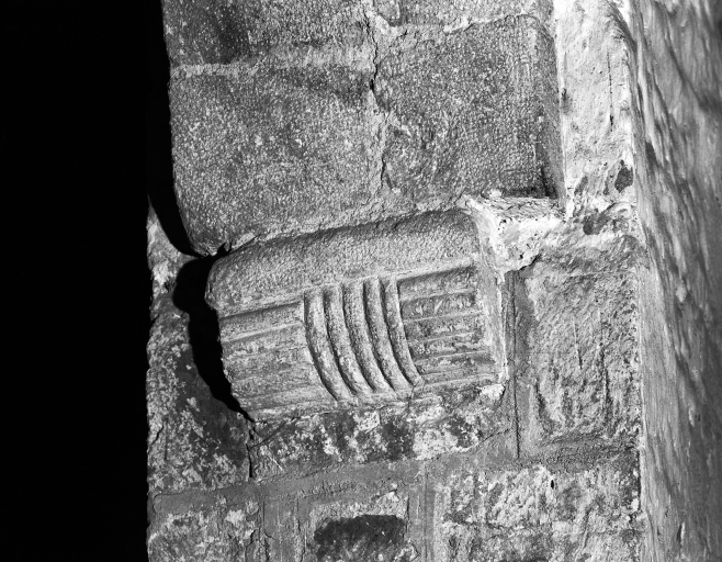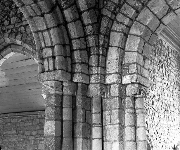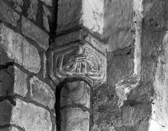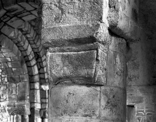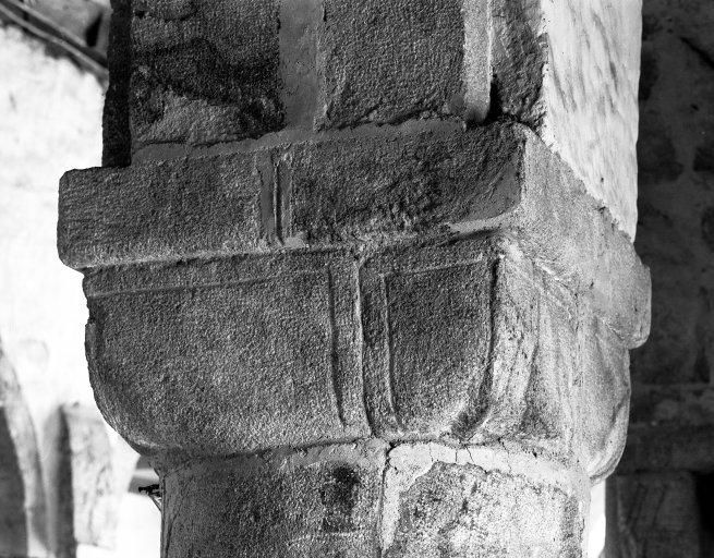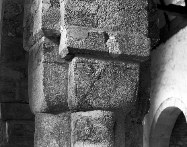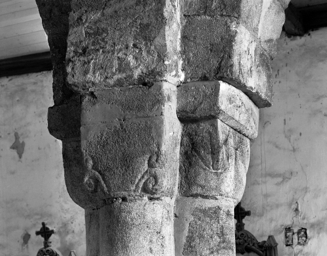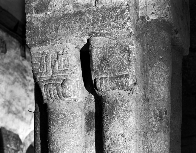 Le décor varie d'un chapiteau à l'autre. Chapiteaux décorés de volutes, d'entrelacs, de feuillage, de pointe de diamant, de figures grossières, de cordage enroulé et de décors géométriques.