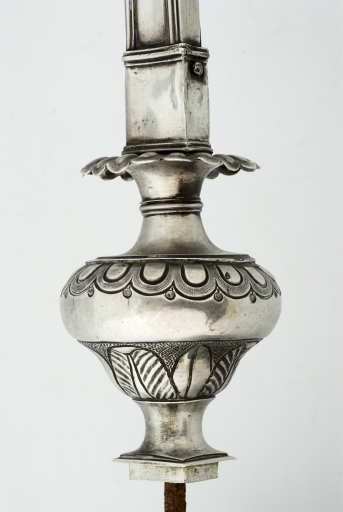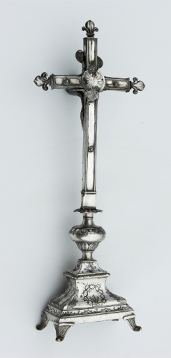 Pied en laiton argenté ; croix, noeud et colerette en argent sur âme de bois. Christ en croix moulé.