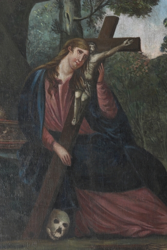 Sur fond de paysage, dans la grotte de la Sainte-Baume, sainte Madeleine au désert médite sur le Crucifix avec, près d'elle, un crâne, le livre des Evangiles et son attribut : le vase de parfum.