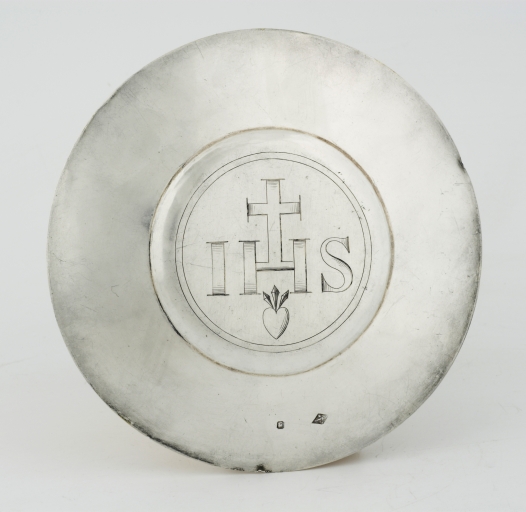 Poinçon d'orfèvre et de garantie et titre sur le pied, la coupe et la patène.