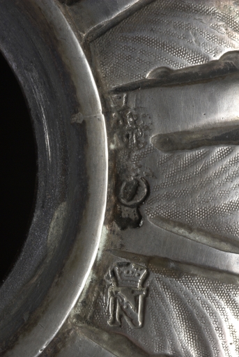 Poinçon de communauté sous le noeud : N couronné (1782) et O coutronné (1784), poinçon de maître : JPMT. Autre poinçon mal insculpé, en partie masqué sous le noeud, peut-être de nouveau le poinçon de maître. Lettre O couronné au revers du titulus. Poinçon de maître au revers de la croix : JP MT couronné et au revers du titulus.