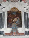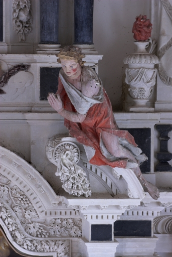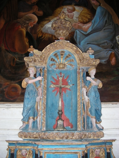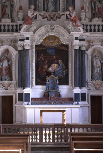 Retable architecturé en calcaire et marbre à trois travées sur trois niveaux. Travée centrale à fronton interrompu, contretable occupée par un tableau, partie supérieure à niche bordée de quatre colonnes en marbre supportant un fronton triangulaire avec applications de marbre. Travées latérales à deux niveaux de niches, les niches inférieures en plein cintre encadrées de colonnes corinthiennes en marbre noir, les niches supérieures à fronton cintré, dais et draperies. Pots à feu et à fleurs, statues et têtes d'anges ou d'angelots, ainsi que des applications de marbre noir dans le fronton supérieur et autour des niches animent le décor d'architecture du retable. Le tabernacle en bois polychrome enchassé au centre de deux gradins se développe sur deux niveaux, le tabernacle à niches surmonté d'un dais dont la corniche est supportée par deux cariatides, avec niche au centre destinée à accueillir une croix de procession.