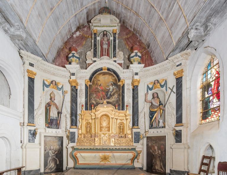 Ses poignets sont liés par une corde. Il tient une palme dans sa main droite utilisée lors de la Flagellation.