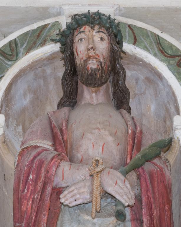 Le Christ est debout. Il revêt le perizonium et le manteau pourpre. Son corps est couvert de traces de sang rouges. On devine ses côtes.