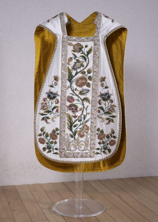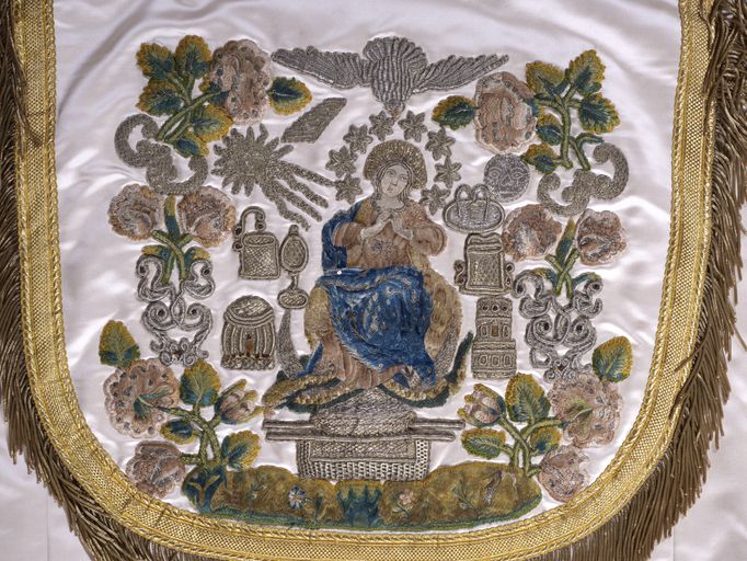 Le décor sur fond de satin blanc, parsemé de vases d'iris, œillets, tulipes, pervenches ou pivoines, brodés en fils d'or, d'argent ou de soie polychromes, tous différents, destine l'ornement aux offices de la Vierge. Sur la chaperon de la chape, on a illustré un dogme dont l'iconographie s'est fixée à la fin du 16e siècle : l'Immaculée Conception. Marie, assise au-dessus du croissant, les mains jointes, la tête couronnée d'étoiles, foule le serpent. Elle est entourée de symboles des litanies, sortis tout droit du Cantique des Cantiques de la Bible et qui sont destinés à rappeler sa pureté, sa beauté ou son rôle de médiatrice entre les hommes et Dieu : elle est belle comme la lune, resplendissante comme le soleil, pure comme le miroir sans tache ; c'est elle la tour de David, le temple de Jérusalem, le puits d'eau vive, la fontaine, l'échelle de Jacob, l'Arche de l'Alliance, la porte du ciel.