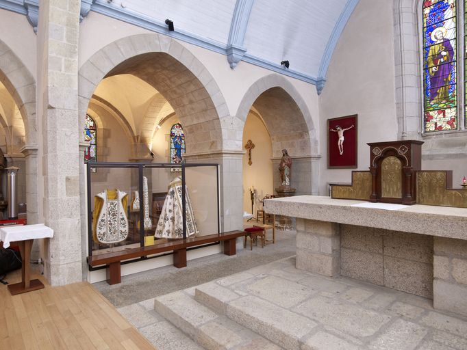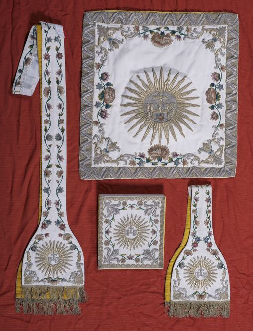 L'ornement blanc conservé dans l'église de Ruffiac s'inscrit dans la tradition de la broderie pratiquée par les ateliers monastiques d'Ursulines qui ont porté cet art "mineur" à son sommet dans le courant du 17e siècle. Il a pu être commandé aux Ursulines de Malestroit. La chape est en satin brodé, le reste de l'ornement - chasuble, dalmatique, deux étoles, manipule et voile du calice - est en gros de Tours moiré et brodé.
