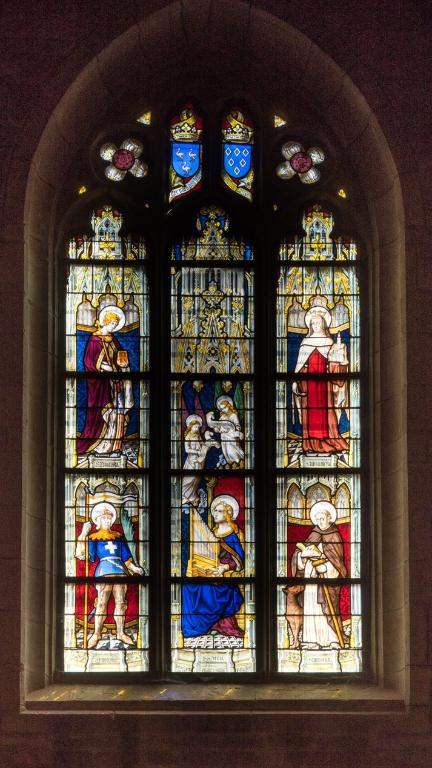 Le renouveau du culte marial durant la seconde moitié du 19e siècle et le changement de statut de l'église, élevée au rang de basilique en 1891, entraînèrent une vaste campagne de commande de vitraux. L'atelier du Carmel du Mans avait déjà signé la restauration de trois verrières du 15e siècle lorsqu'il se vit confier, en 1893, sous l'autorité du maître verrier Hucher, la fabrication de six verrières historiées dont certaines évoquent l'origine du sanctuaire et du culte qui s'y rattache.