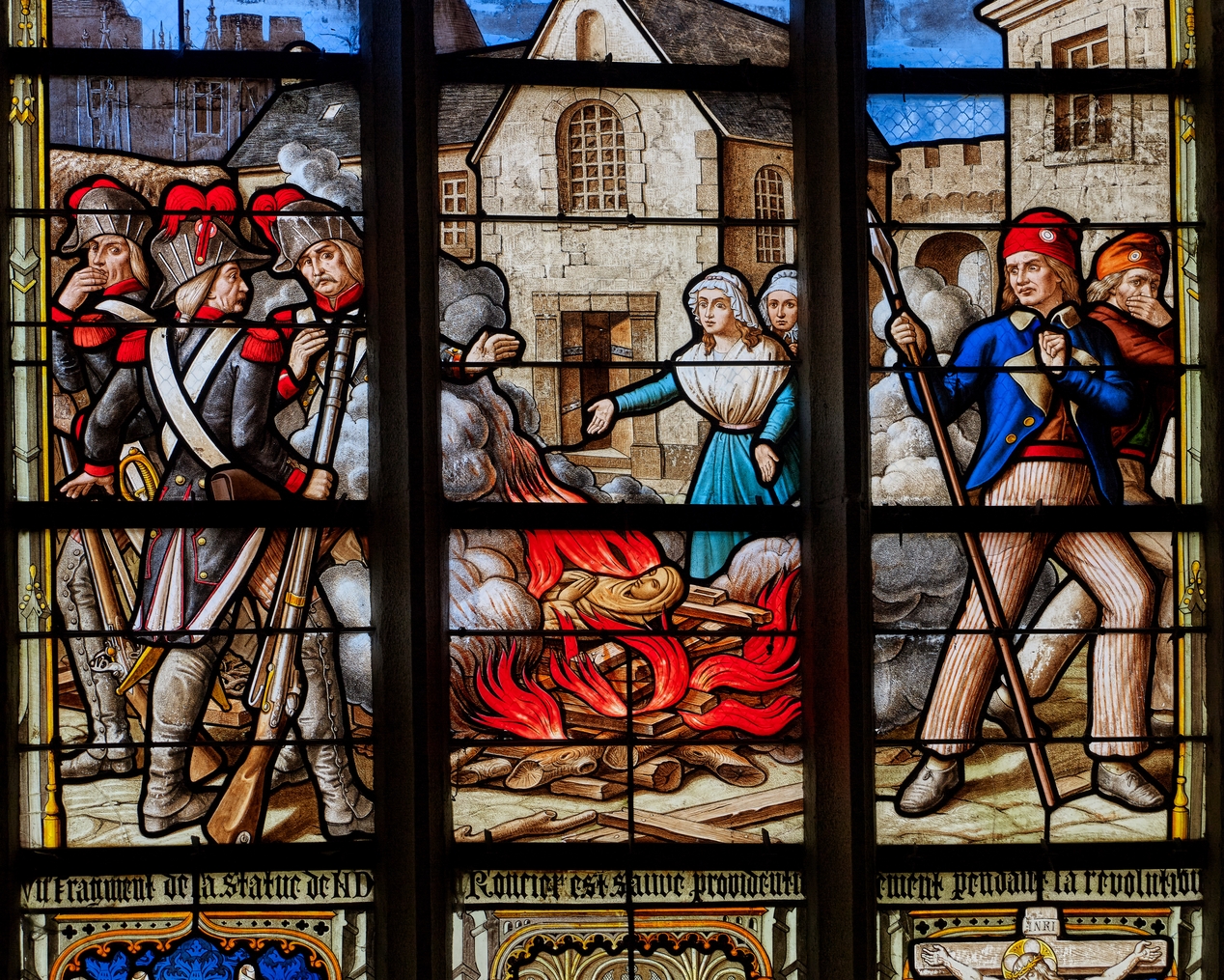 Cette verrière représente la destruction de la statue de Notre-Dame du Roncier en 1793, pendant la période révolutionnaire. Une paroissienne parvient à sauver des flammes quelques fragments ; ils sont aujourd’hui conservés dans un reliquaire placé dans la chapelle du pèlerinage et à l’intérieur de la nouvelle statue de Notre-Dame du Roncier.