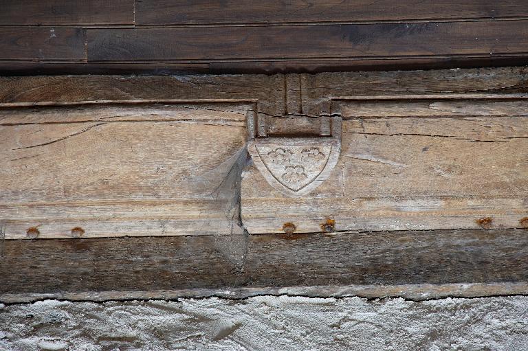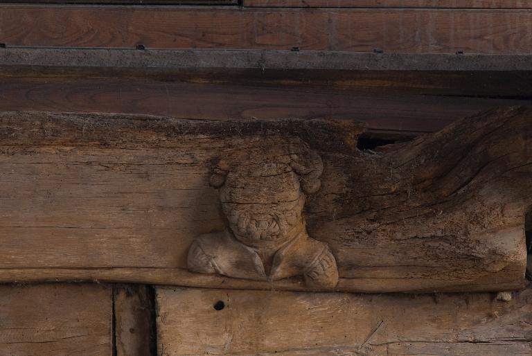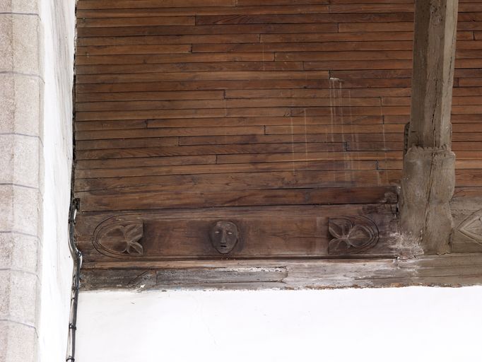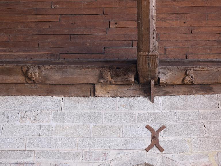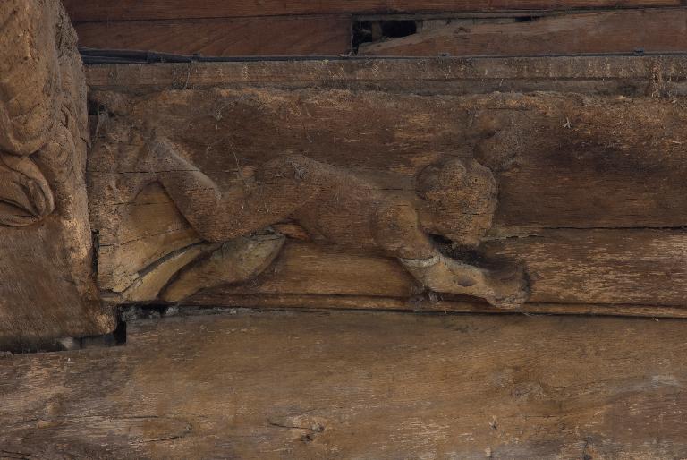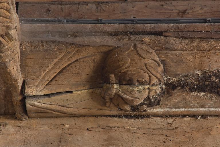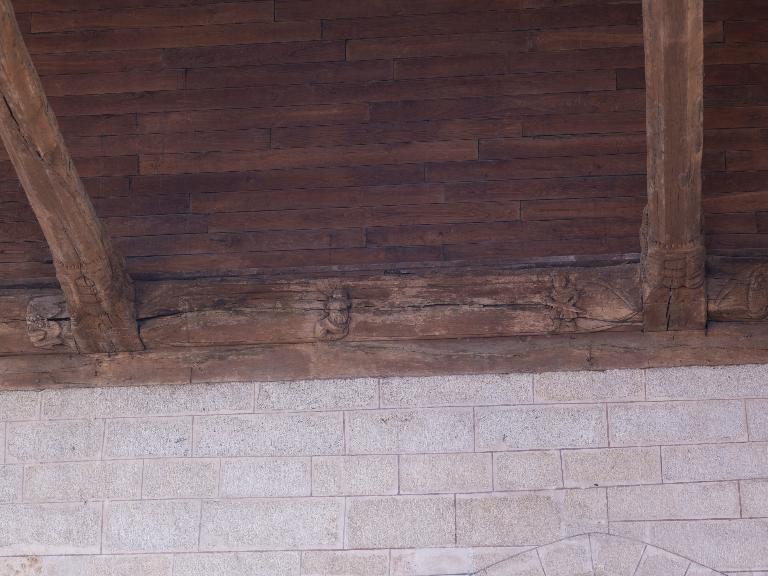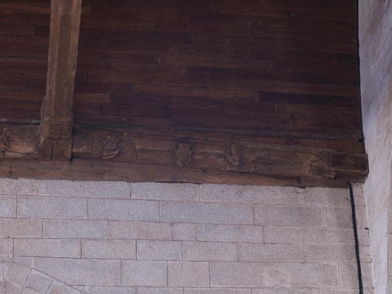 Au sommet des murs, des sablières sont sculptées de décors très variés : armoiries, visages ou bustes d’hommes ou de femmes portant costumes ou chapeaux, anges, masques, animaux, soleil représentant le jour ou lune figurant la nuit, chien courant après un lapin, homme sauvage recouvert d’écailles, homme dégainant une épée ou portant une hache sur l’épaule, musiciens ou scène de la Visitation…