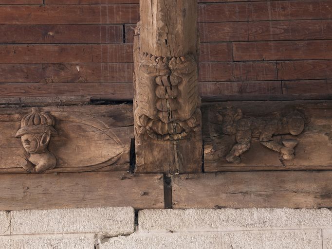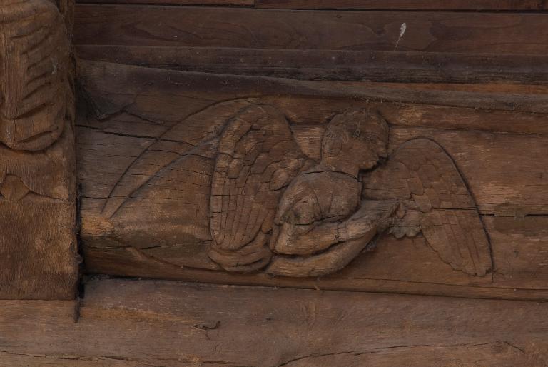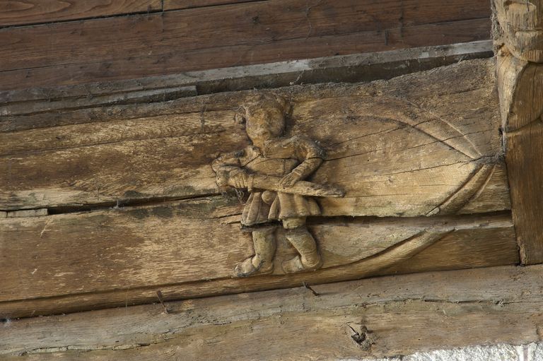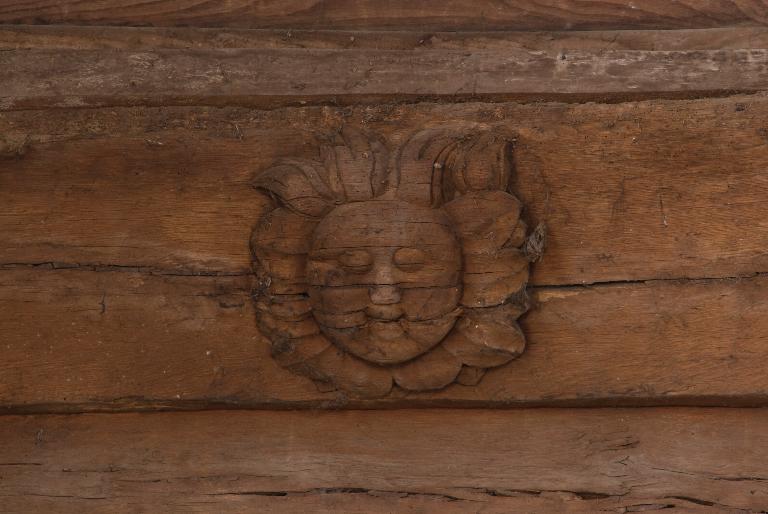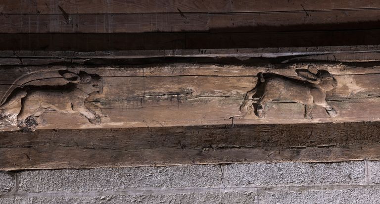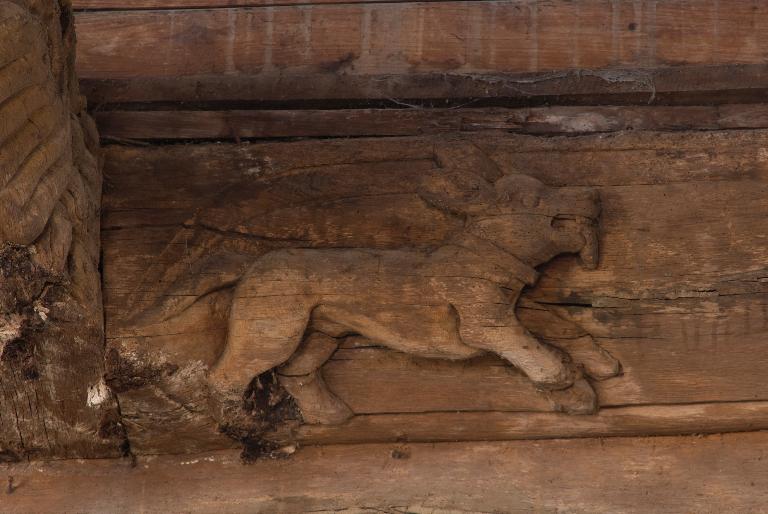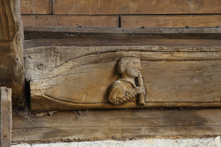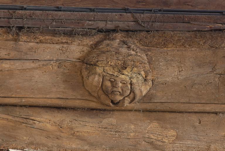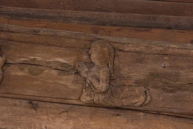 Au sommet des murs, des sablières sont sculptées de décors très variés : armoiries, visages ou bustes d’hommes ou de femmes portant costumes ou chapeaux, anges, masques, animaux, soleil représentant le jour ou lune figurant la nuit, chien courant après un lapin, homme sauvage recouvert d’écailles, homme dégainant une épée ou portant une hache sur l’épaule, musiciens ou scène de la Visitation…