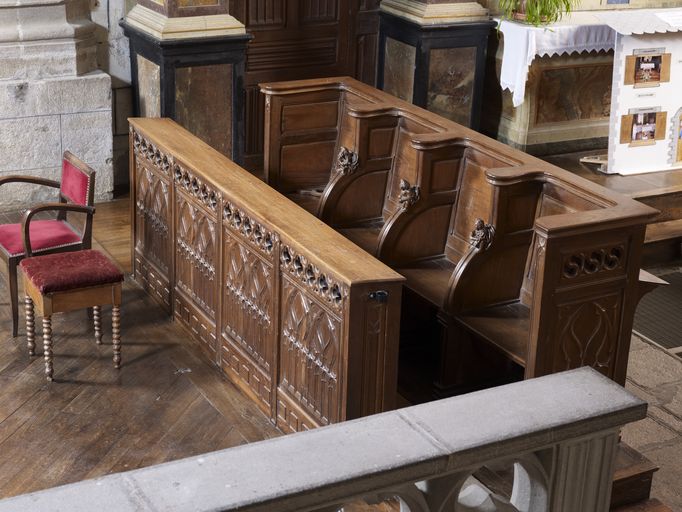 Deux ensembles de stalles ferment le chœur ; celles du nord ont été réalisées à la fin du 18e siècle ; celles du sud, ornées de petits personnages, datent du 19e siècle, comme les agenouilloirs.