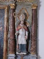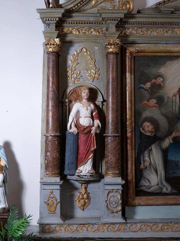 Statue réalisée pendant la seconde moitié du 17e siècle, d'exécution simple mais non dénuée de qualité. Posée aujourd'hui sur le retable du Rosaire, elle provient de l'autel de Sainte-Barbe, l'une des quatre autels de l'église, supprimé on ne sait à quelle époque (Le Mené).