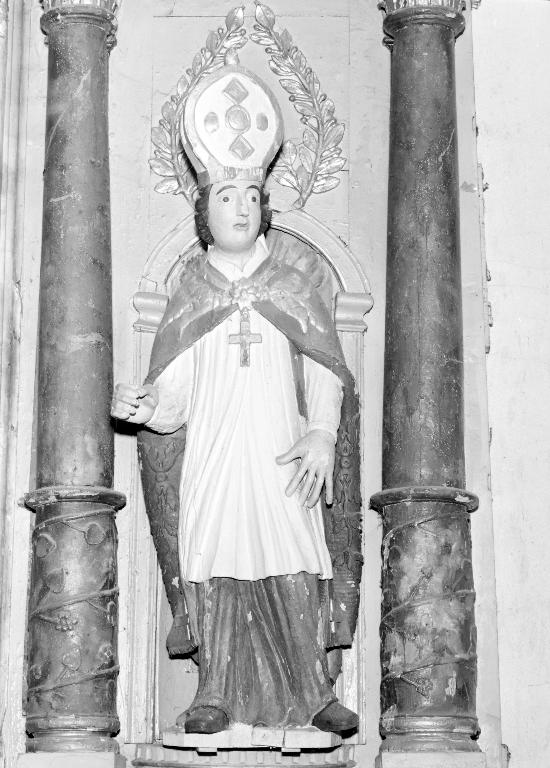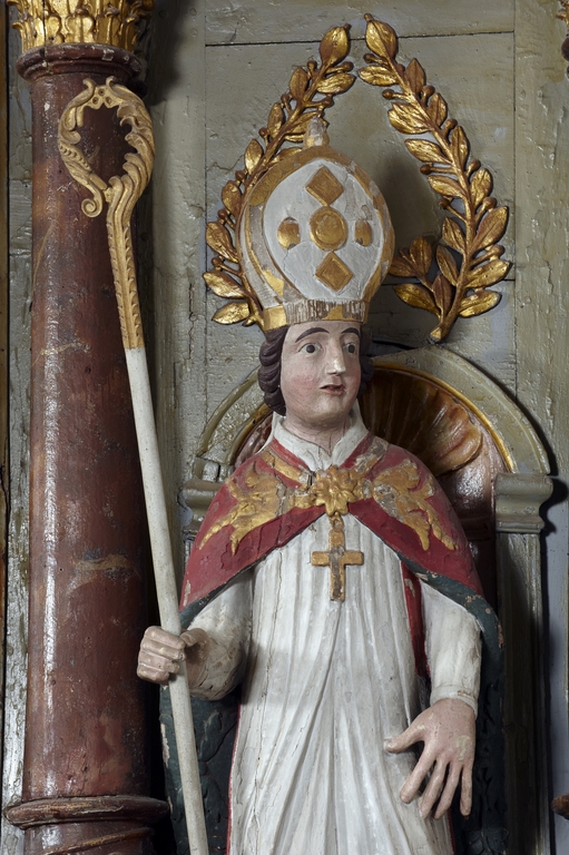 Polychromie restaurée ; fente verticale depuis la jambe droite jusqu'à la tête. Une crosse a été ajoutée.