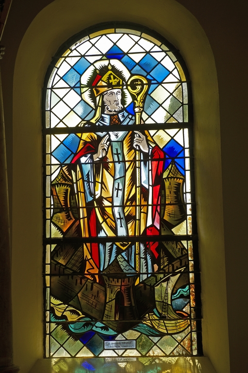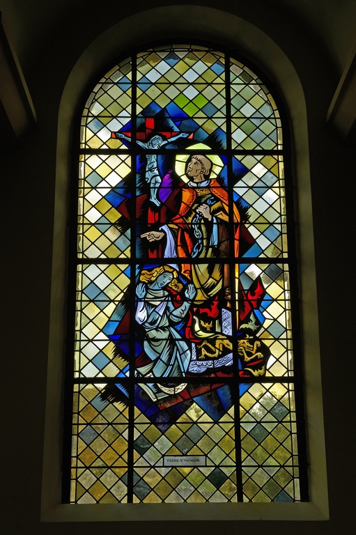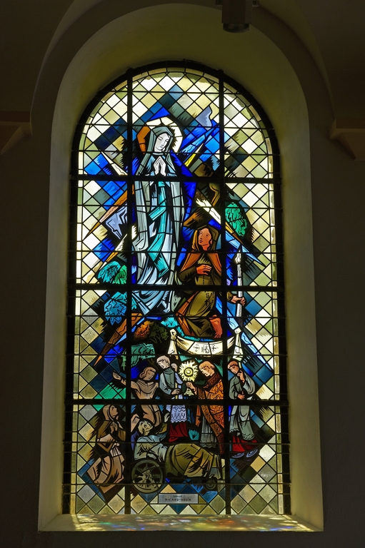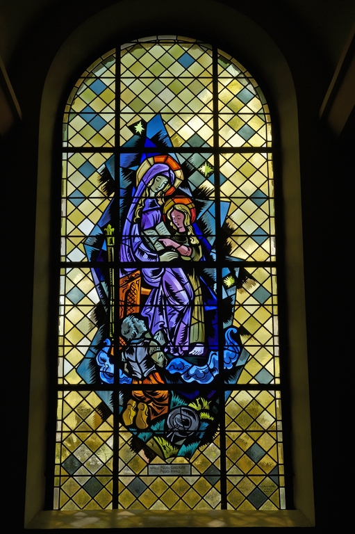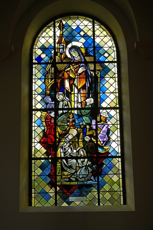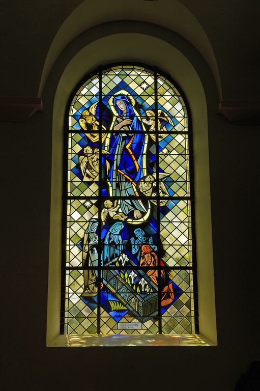 Signature et date dans l'angle inférieur gauche de la verrière de la baie 5 : KLEIN ET JUMEL / VITRAUX / RENNES 1960. Les baies sont numérotées impaires au nord et paires au sud.