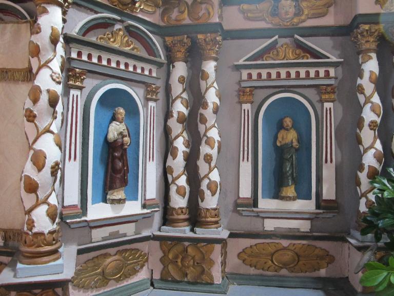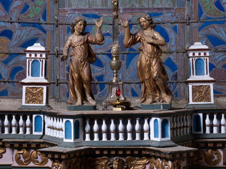 L’ensemble du maître-autel, du 18e siècle, rassemble des œuvres de plusieurs provenances ; l’autel-tombeau à élévation galbée porte en son centre un Agneau aux sept sceaux et, dans les angles, deux angelots, de bonne facture, que l’on peut associer aux deux petits anges qui encadrent la croix d'autel du 19e siècle posée sur le tabernacle. Ce dernier est sans rapport avec l’autel - aussi bien dans ses dimensions que dans sa réalisation plus frustre - comme le montre une photographie où il est supporté par le vestige d’autel déposé aujourd’hui dans la chapelle des fonts baptismaux. Les ailes du tabernacle sont occupées par des niches architecturées, séparées entre elles et d'avec le tabernacle par deux colonnettes torses où s’accrochent des rinceaux de vigne ; la frise supérieure, rythmée d’angelots, est surmontée d’une rangée de petits balustres ; chaque niche abrite une figurine ; à gauche : saint Pierre et saint Paul ; à droite : saint Jean et un apôtre non identifié.