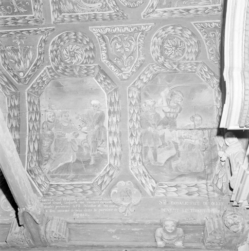 Voûte lambrissée peinte : Panneau III sainte Noyale et Nizan, panneau IV le décollement de sainte Noyale.Immatriculation