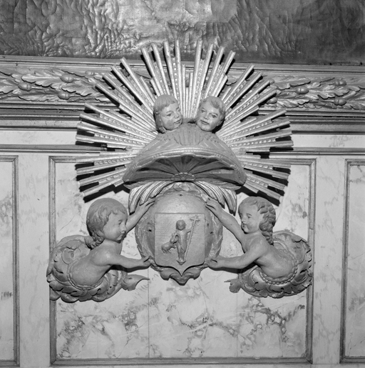 Maître-autel dans le choeur : détail du motif central.Immatriculation