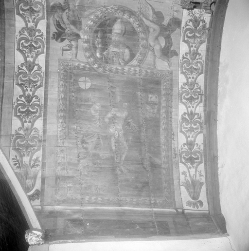 Voûte lambrissée peinte, bras nord du transept, panneau ouest : la Flagellation.Immatriculation