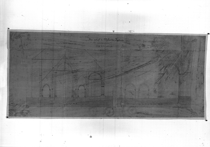 Coupe sud nord dans la nef du porche sud aux Fonts baptismaux, et coupe ouest-est dans la nef et le transept au 28 mai 1886Immatriculation