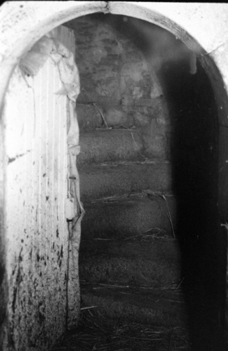 Logis primitif, vue intérieure, départ de l'escalier en vis (cliché A. Cherrier, pré-inventaire, 1967)Immatriculation