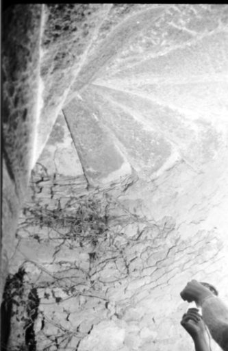 Logis primitif, vue intérieure, escalier en vis (cliché A. Cherrier, pré-inventaire, 1967)Immatriculation