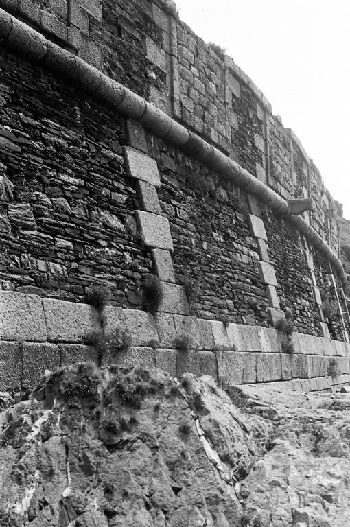 Vue de la batterie de Cornouaille en 1967 : escarpe, chaînes harpées en pierres de taille de graniteImmatriculation
