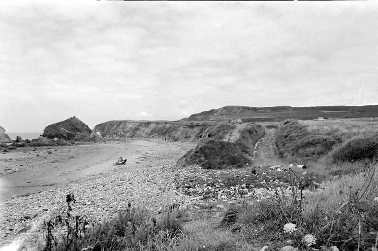 Champ de bataille : l'anse et la plage de Trez-Rouz en 1967. Vue des retranchements pris parallèlement à la côte. En arrière plan : crête de l'extrémité droite des lignes de Quélern (4e quart du 18e siècle)Immatriculation