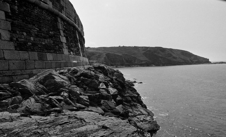 Vue de la batterie de Cornouaille en 1967 : escarpe, chaînes harpées en pierres de taille de graniteImmatriculation