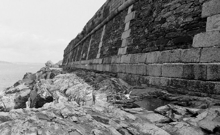 Vue de la batterie de Cornouaille en 1967 : escarpe, chaînes harpées en pierres de taille de graniteImmatriculation