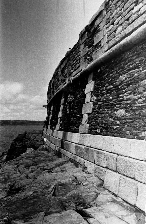 Vue de la batterie de Cornouaille en 1967 : escarpe, chaînes harpées en pierres de taille de graniteImmatriculation