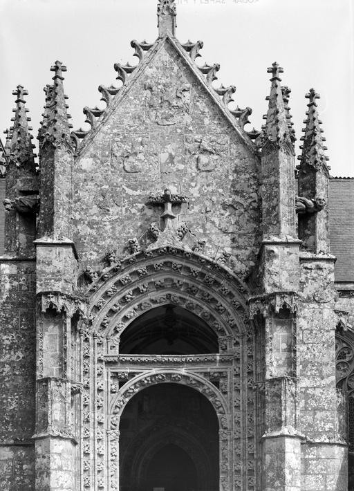 Tympan du porche et ses cinq armoiries.Immatriculation