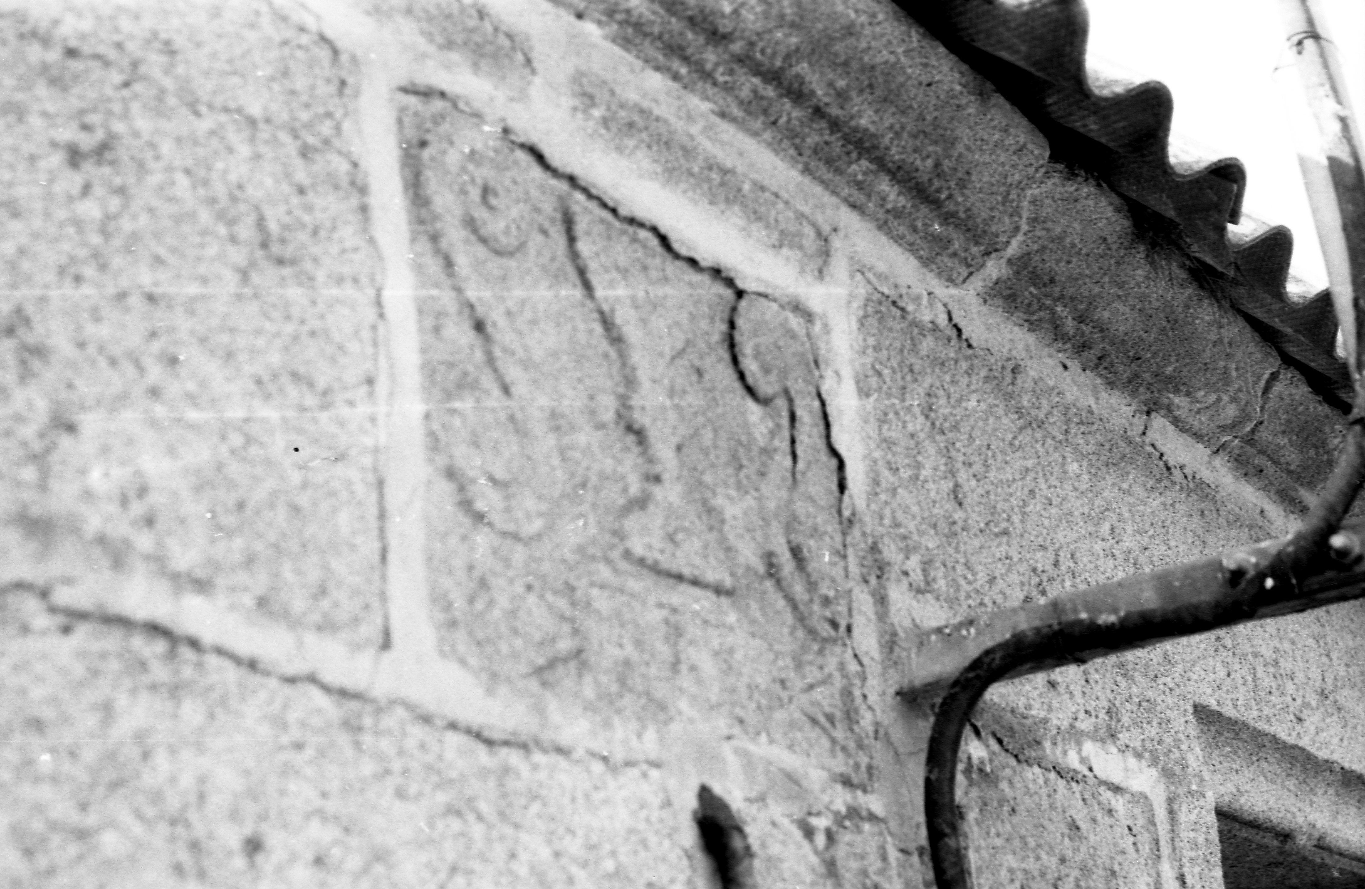 Elévation sud, détail de la pierre sculptée à droite de la porte, état en 1967Immatriculation