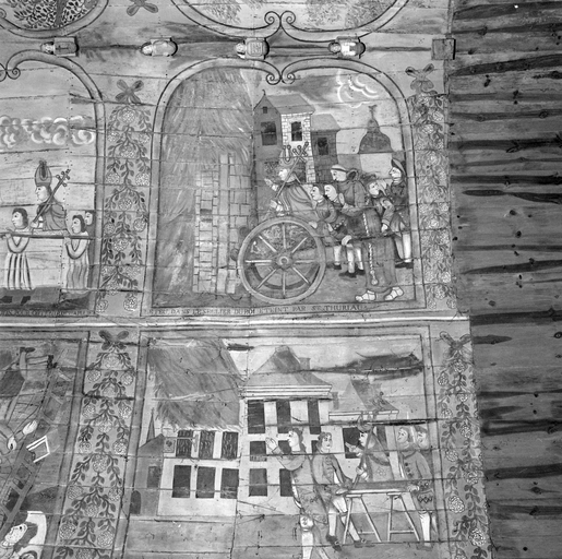 Lambris peint de la voûte, nef au sud : panneau 23, incendie du cellier du roi ; panneau 24 : incendie de l'aubergeImmatriculation