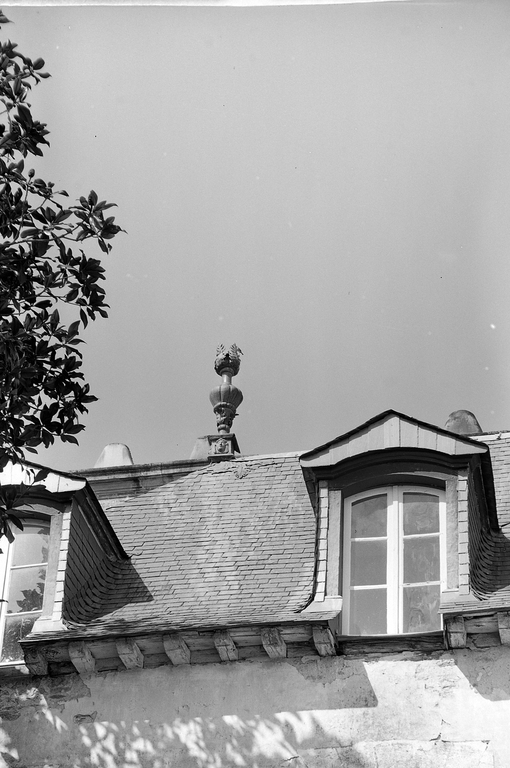 Vue de détail de l'épi de faîtage de l'avant corps sud.Immatriculation