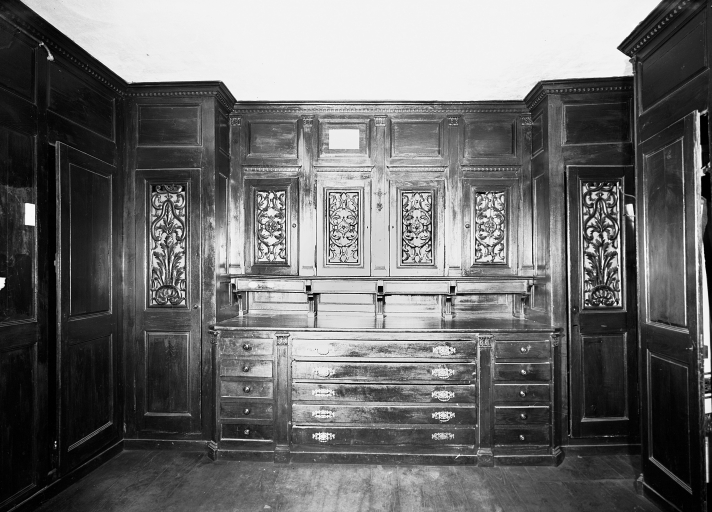 Ensemble de la sacristie : lambris de revêtement, chasublier, meubles de sacristie,