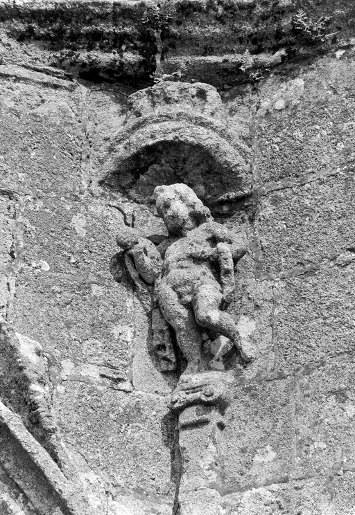 Clocher, face ouest, colonne sud de la porte : détail de la figure sculptéeImmatriculation
