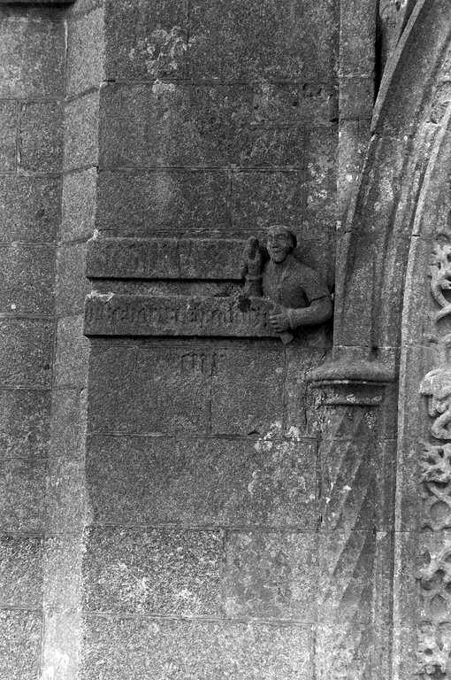 Façade ouest, porte : contrefort nord, détail de la figure sculptéeImmatriculation