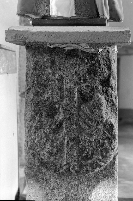 Croisillon du transept, angle nord est, pied de granit : détail du blasonImmatriculation