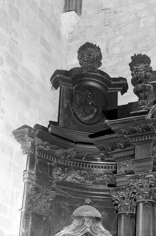 Croisillon nord, mur est : retable : fronton, détail du médaillon nord, saint MarcImmatriculation