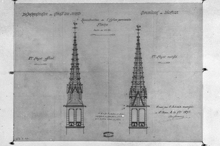 Projets de reconstruction de la flèche, 1893 (repro. AD Côtes du nord, série V)Immatriculation