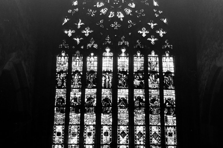 Maîtresse-vitre : Verrière à personnages : Vie de saint Jacques, Vie du Christ (baie 0),