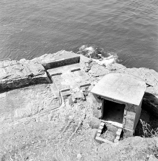 Vue de la partie sud-ouest de la batterie de l'îlot des Capucins en 1969. Poste de projecteur français, abri de combat ruiné ; installation photoélectriqueImmatriculation