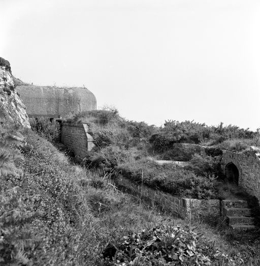 Vue de la batterie de côte du Petit Gouin en 1969. La batterie basse a été augmentée d'un bunker - casemate de type 671 coiffant le débouché du magasin à poudre sous rocImmatriculation