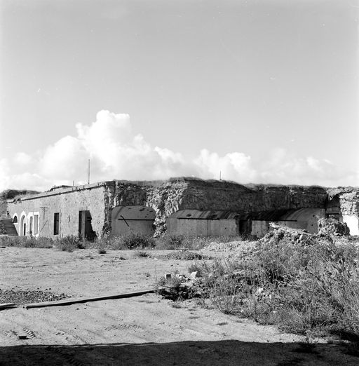 Vue du réduit de Quélern en 1969 : extrémité sud de la caserne casematée en partie détruite par les bombardements de 1944. Au premier plan : deux casemates éventréesImmatriculation